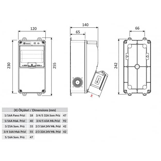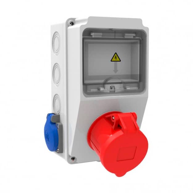 Щиток для 5 автоматов, 1 розетка 4/32A, 2 розетки Sсhuko, IP44