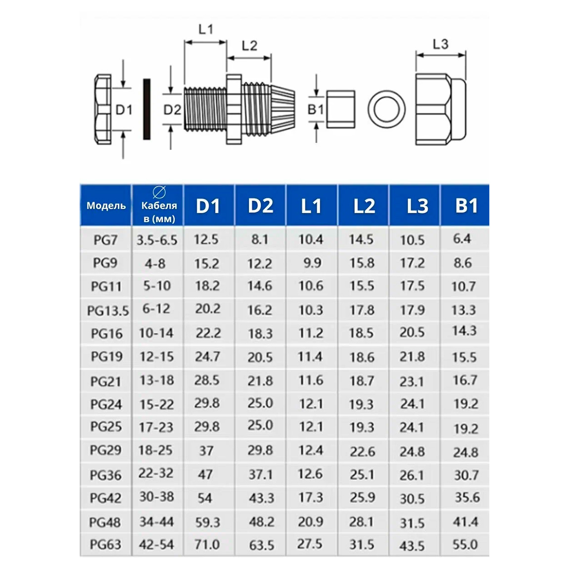 область уплотнения кабеля Ø 6 - 12 мм