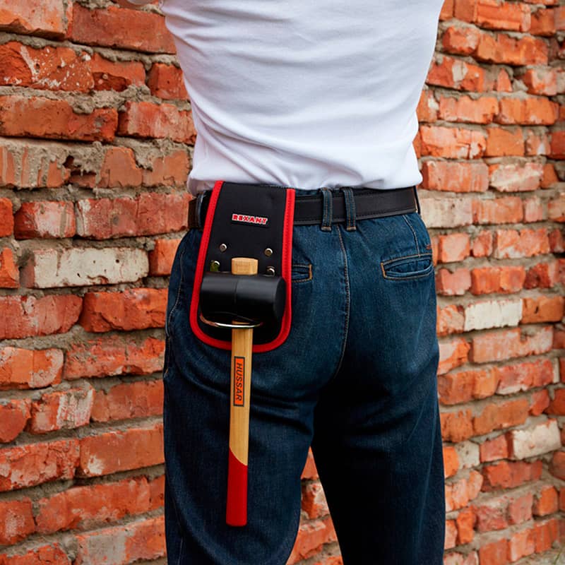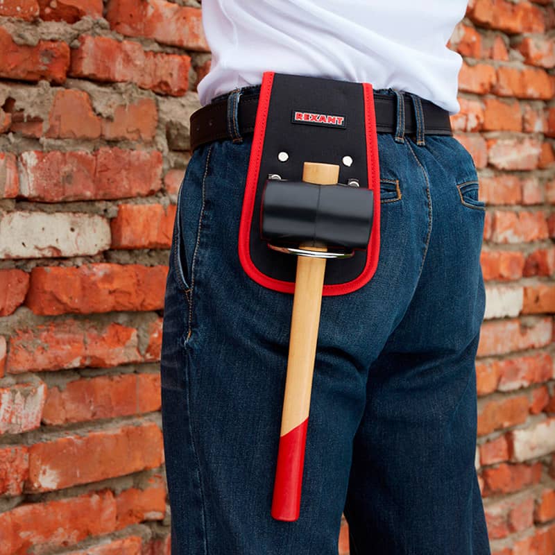 Держатель для молотка крепится на ремне и надежно удерживает инструмент под рукой.